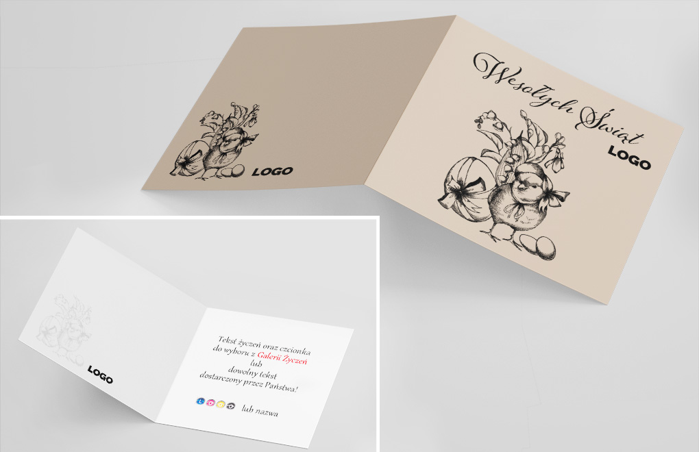 Projekt z naszej galerii, wstawienie logo oraz życzeń, wydruk, koperta.