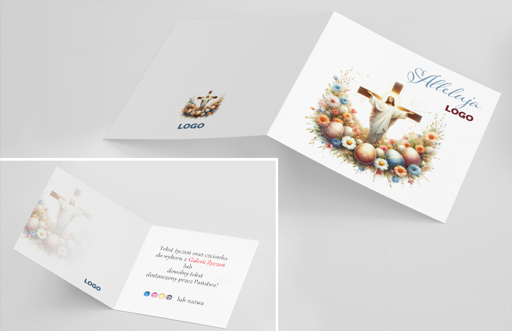 Projekt z naszej galerii, wstawienie logo oraz życzeń, wydruk, koperta.